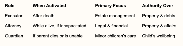 These roles do not overlap. For example, an attorney's legal power ends at death, at which point the executor steps in. A guardian only makes decisions about a child’s welfare, and does not have control over your assets unless stated in a trust or will.