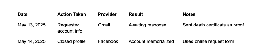 Good records are essential for protecting yourself and the estate. Keep a clear log of every step you take, including attempts to gain access, communications with companies, and any actions within the digital accounts.