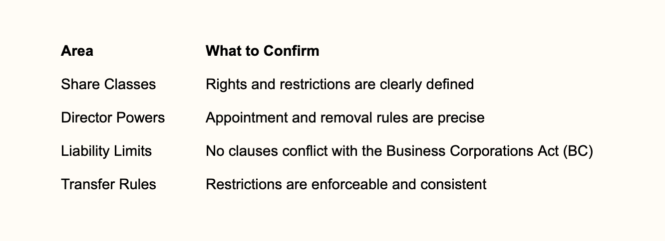 Under the Business Corporations Act, your articles can define voting rights, classes of shares, and limits on director authority. These details directly affect who controls the corporation and how ownership interests are structured.