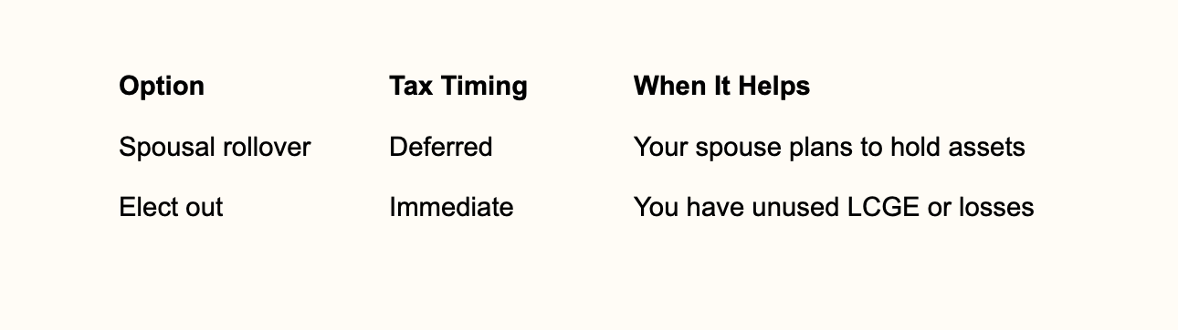 You can avoid immediate tax in some cases. A transfer to a surviving spouse or a spousal trust often qualifies for a rollover at cost. This defers tax until the spouse sells the asset or dies. The CRA explains how capital gains arise at death in its guidance on taxable capital gains on property at death.