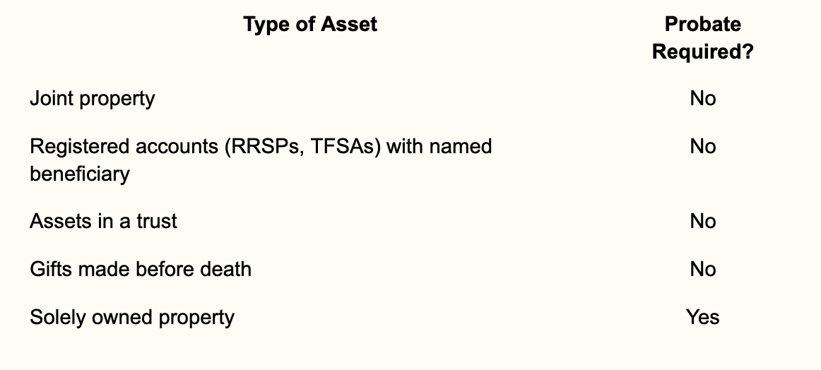 Probate may not be needed if all assets are jointly owned with right of survivorship, or have designated beneficiaries like insurance policies or RRSPs. Some banks and organizations may still insist on probate, even for smaller amounts, to protect themselves.